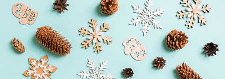 Top view of New Year ornament made of white snowflakes and pine cones on colorful background. Banner winter holiday concept with empty space for your design.
