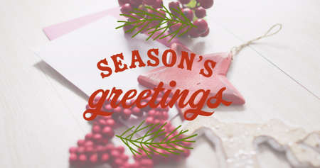 Image of seasons greetings text over christmas decorations. christmas, winter, tradition and celebration concept digitally generated image.