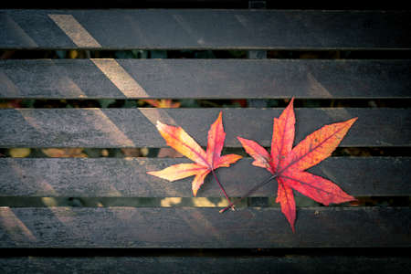 Autumn leaves on a wooden bench in the park. Selective focus