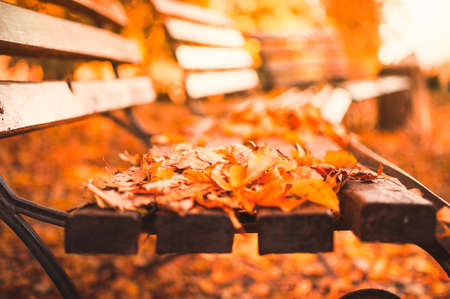 empty bench in the autumn park is strewn with red and yellow dry leaves. Golden autumn close-up concept.relaxing place for reflection and contemplation.