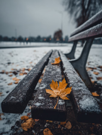 Golden leaf lies on a bench, surrounded by snow and fallen leaves in a serene park, highlighting the stillness of a cold winter afternoon