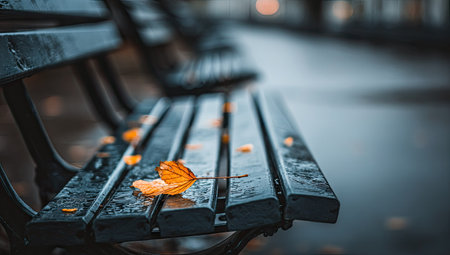 A close-up view presents a weathered wooden bench glistening with raindrops, a single orange leaf rests on the surface. The scene features a shallow depth of field, with soft focus on the blurred background. This moody image portrays an outdoor environment, with potential uses in editorial projects or commercial designs.