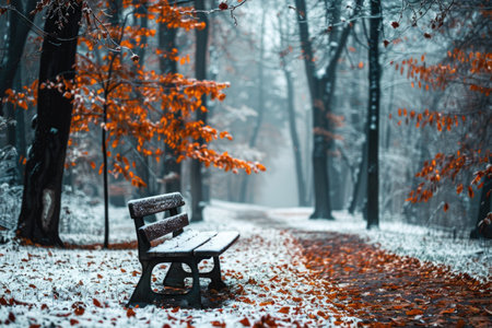 A cozy wooden seat blanketed in new fallen snow, set beside a winding trail layered with colorful autumn leaves, amidst a tranquil, misty woodland during soft snowfa