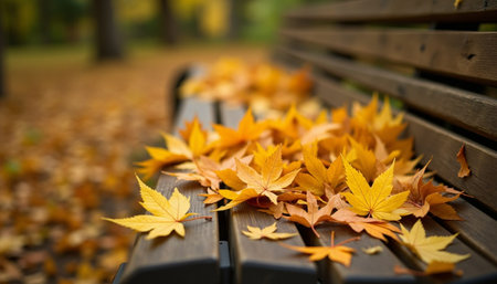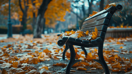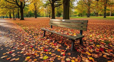 In a peaceful park, a weathered wooden bench is covered with vibrant autumn leaves, creating a picturesque and tranquil atmosphere. The scene captures the essence of fall's beauty.
