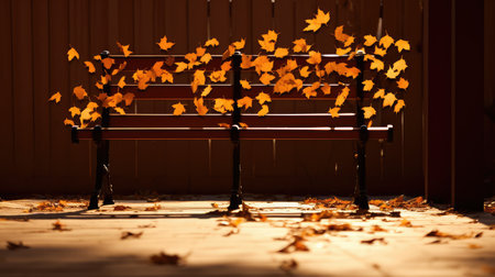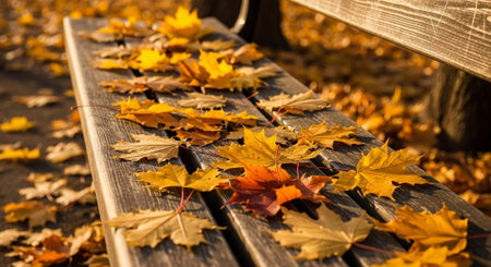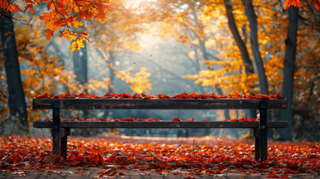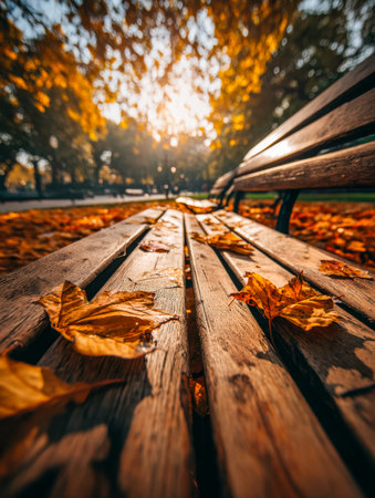 Wooden bench lined with colorful autumn leaves in a tranquil park. Soft golden sunlight filters through trees, enhancing the peaceful atmosphere.