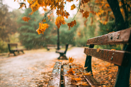 Wet park bench covered with fallen leaves on a rainy autumn day
