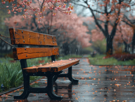 Rain falling on cherry blossoms . Background Wet bench. Melancholy. Realistic photo.