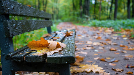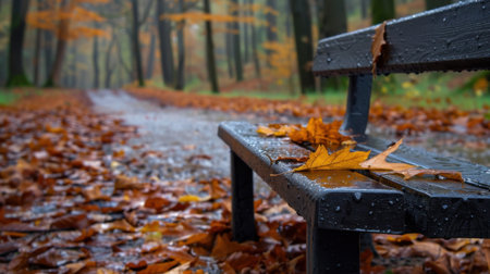 A serene autumn scene featuring a rain-soaked park bench adorned with colorful leaves, set against a blurred forest pathway. The atmosphere evokes peace and tranquility.