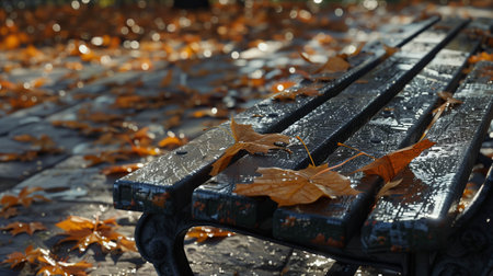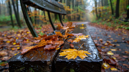 A serene park scene features a wet bench adorned with colorful autumn leaves, surrounded by vibrant trees, creating a peaceful and tranquil atmosphere.