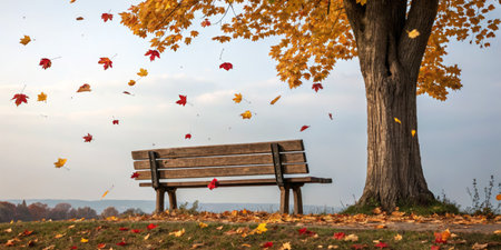 Golden and red leaves dance in the air surrounding a wooden bench located beneath a large tree on a serene autumn day. The peaceful atmosphere invites relaxation.