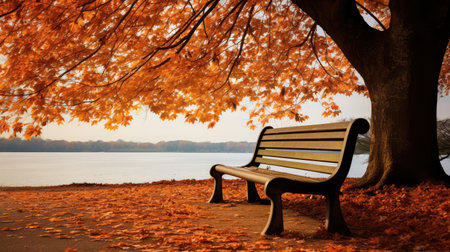 A bench is placed by a lake with a tree in the background. The scene is peaceful and serene, with the autumn leaves adding a touch of color to the landscape