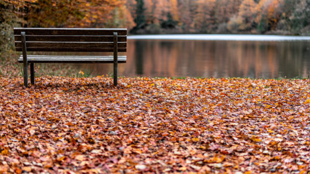 Autumn leaves covering a park bench by a tranquil lake
