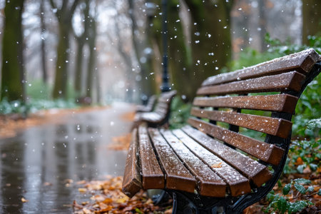 A snowdusted park bench with blurred trees and a wet path in the background