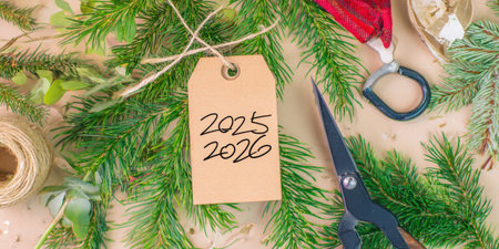 Crafting a festive holiday atmosphere involves evergreen pine branches, twine, and a tag indicating future years 2025 and 2026, representing future holiday planning and seasonal preparation