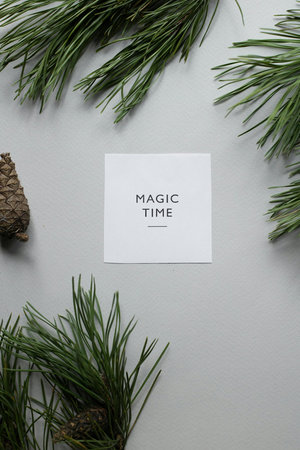 A blank kraft tag surrounded by evergreen branches, ideal for gift wrapping or holiday decorations.