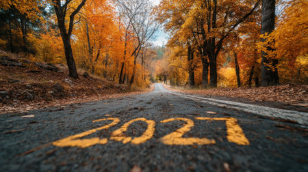 Vibrant red, orange, and yellow autumn leaves artfully arranged to form the number 2026 on dark forest ground, symbolizing the upcoming new year. This seasonal image captures the beauty of fall and the anticipation of future events.