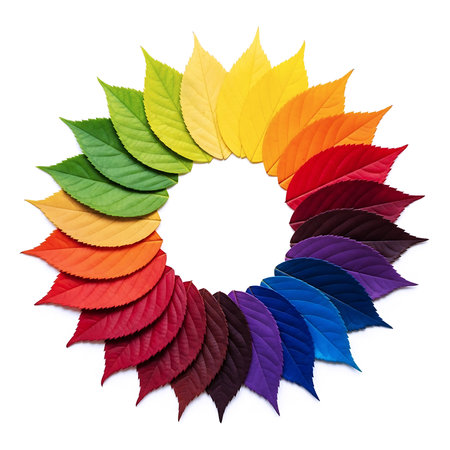 Circular Rainbow Leaves Color Wheel Arrangement Isolated on White Background for Color Theory, Seasonal Design, and Creative Branding Concept