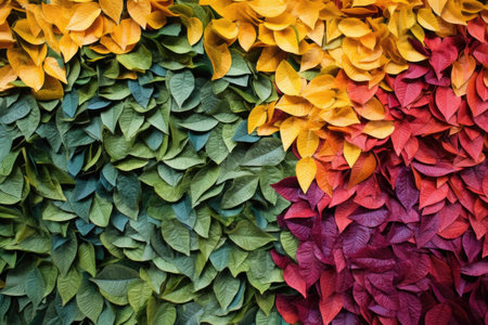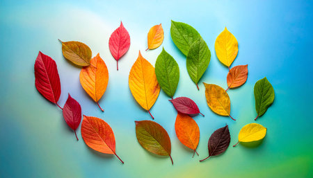 A stunning arrangement of colorful leaves in a rainbow pattern, showcasing the beauty of nature.