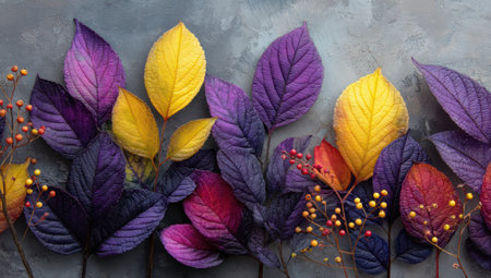 An artistic composition features colorful leaves in shades of purple, yellow, and red. The image showcases textures, with a focus on depth and detail. The arrangement suggests an outdoor environment, possibly for decorative use or graphic design projects. The leaves are arranged to give a sense of depth and style.