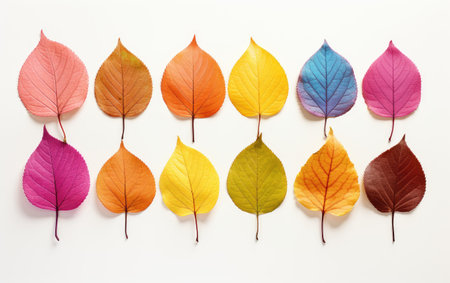 Colorful autumn leaves arranged on a white background creating a beautiful display of fall colors, showcasing the transition of seasons from summer to winter