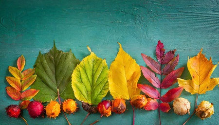 Artistic placement of vibrant fall foliage Flat lay method Seasonal symbolism