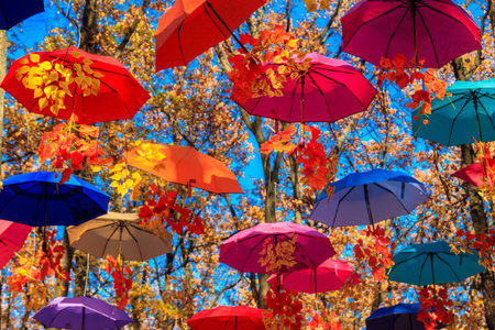 Multicolored umbrellas on the autumn park. Colorful umbrellas hanging among trees in the fall