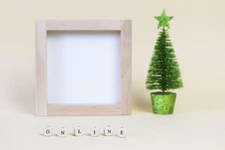 The word online is made up of letters on wooden cubes. Defocused frame and Christmas trees on a yellow background. Copy space - concept for online shopping, delivery of goods, new year