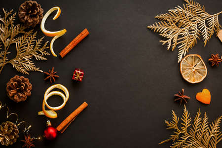 Christmas greeting card with a space for text, flat lay, top view, copy space. Black background with golden star confetti. Branches, orange peel and cinnammon.