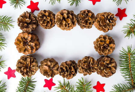 Autumn composition. Frame, pine cones, acorns on white background. Flat lay, top view, copy space