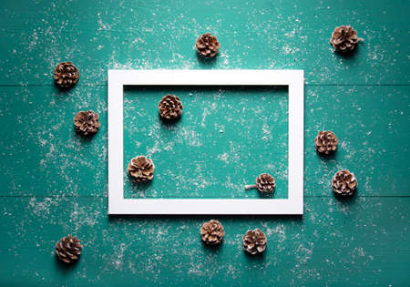 Pine cones lie around a white frame on a turquoise wooden background strewn with snow. Festive winter concept, flat lay, copy space