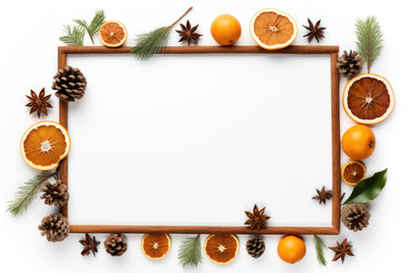 A wooden frame with oranges, pine cones, and star anise. Digital image.