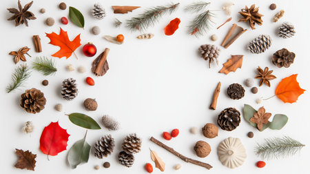 A white background with a variety of fall foliage and items, including pine cones, leaves, and cinnamon sticks, arranged in a circular pattern