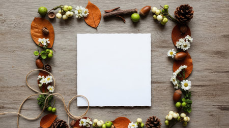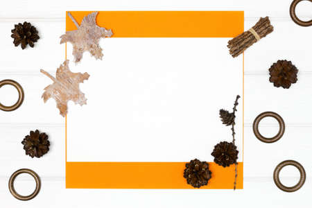Autumn frame background. Blank paper card with fall season forest decor on white wood boards. Minimal flat lay composition with empty space for text