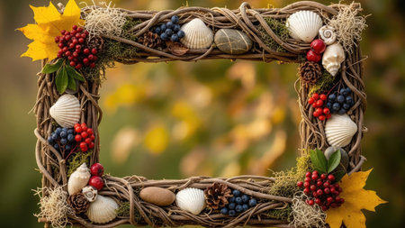 Wooden frame with berries and leaves in the autumn forest. Autumn background.