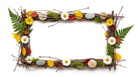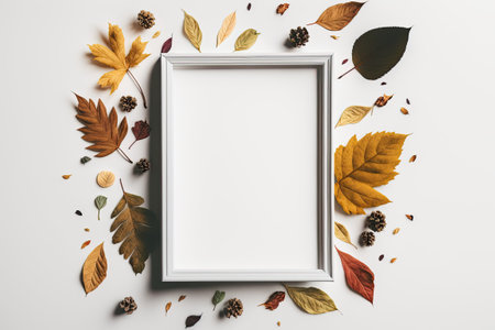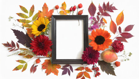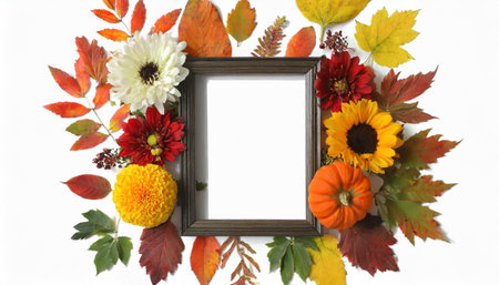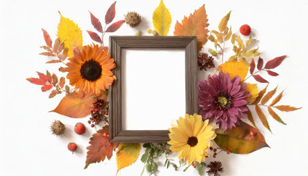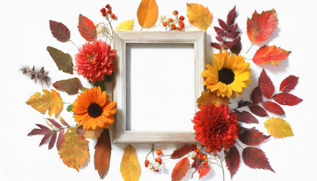 Autumn themed photo frame with flowers and leaves on a white background representing the concept of fall and Thanksgiving