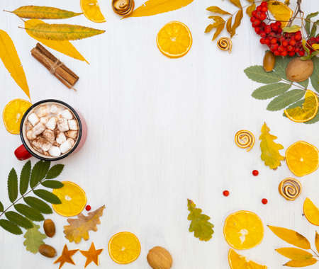 Autumn composition with cocoa and yellow leaves, layout with copy space, and space for text top view