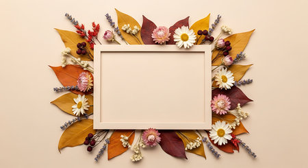 Autumn composition. Frame made of flowers and leaves on beige background. Flat lay, top view, copy space