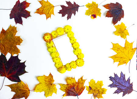 White notebook framed by heads of fresh yellow chrysanthemum flowers with yellow and brown autumn leaves of maple and oak. White floral autumn background. Copy space. Fall concept. Template for text.