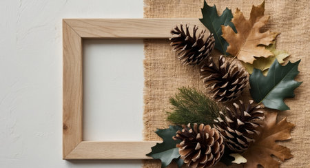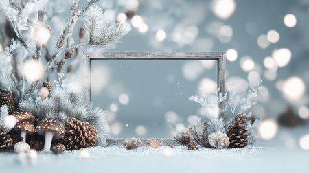 A captivating winter scene displaying a wooden frame surrounded by pinecones and mushrooms, featuring a soft, blurred background for an ethereal feel.