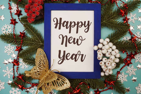New Year Wishes flat lay frame with a Christmas background in a modern and minimalist style. Generative AI