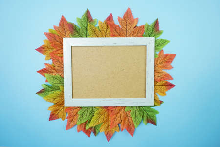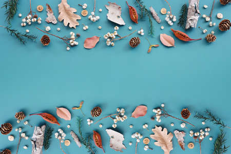 Top view image of autumn forest natural composition over blue background .Flat lay