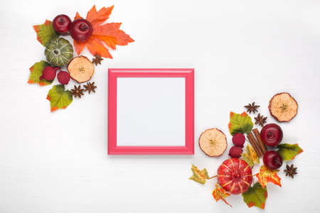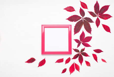 Autumn creative composition. Red leaves, empty pink frame, wild grape berries on white wooden background. Fall, thanksgiving day concept. Flat lay, top view, copy space.