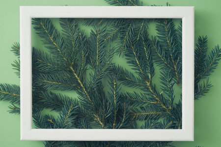 Festive Christmas frame with christmas tree branches and decoration with copyspace