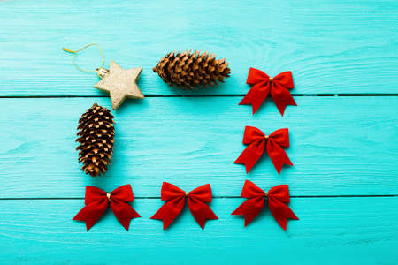 Frame of Christmas accessories on blue wooden background. top view and copy space