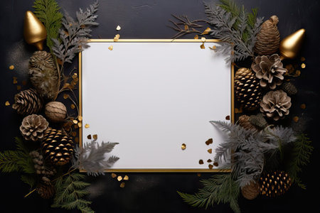 Christmas or New Year background, dark moody board with a photo frame in the center with a blank space for greeting text, decorated with various seasonal botanical elements such as fir branches and cones, flat lay