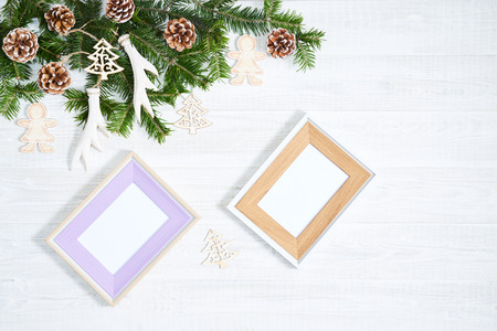 Photo frame and Christmas decorations on color background. Copy space for the text. Template for Christmas greeting card. Merry Christmas and Happy New Year