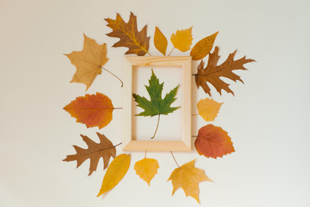 Autumn composition. A frame of autumn fallen leaves on a beige background. Green maple leaf in a wooden frame. Flat layout, top view, copy space