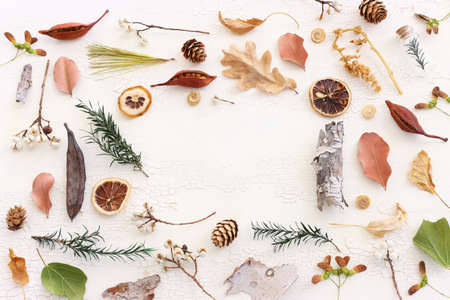 Top view image of autumn forest natural composition over wooden white background .Flat lay