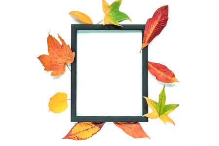 Creative layout of autumn leaves, dry oranges fruit slices and white photo frame. Flat lay, space for text