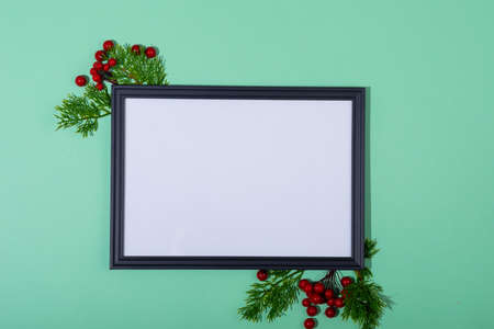Empty picture frame with pine tree and natural christmas decoration on dark brown background. Flat lay minimal new year mockup template. Creative styled image composition with trendy organic christmas baubles.